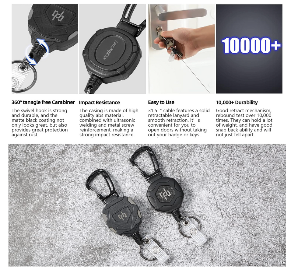 - RELIABLITY The SHENGXIN Badge Reel is equipped with a powerful spring that ensures reliable retraction, keeping your cards and keys secure while protecting your information. With the capability to be pulled over 10,000 times, it has been rigorously tested for consistent performance. Its robust internal coil spring makes it a heavy-duty retractable keychain that surpasses testing standards for similar products.